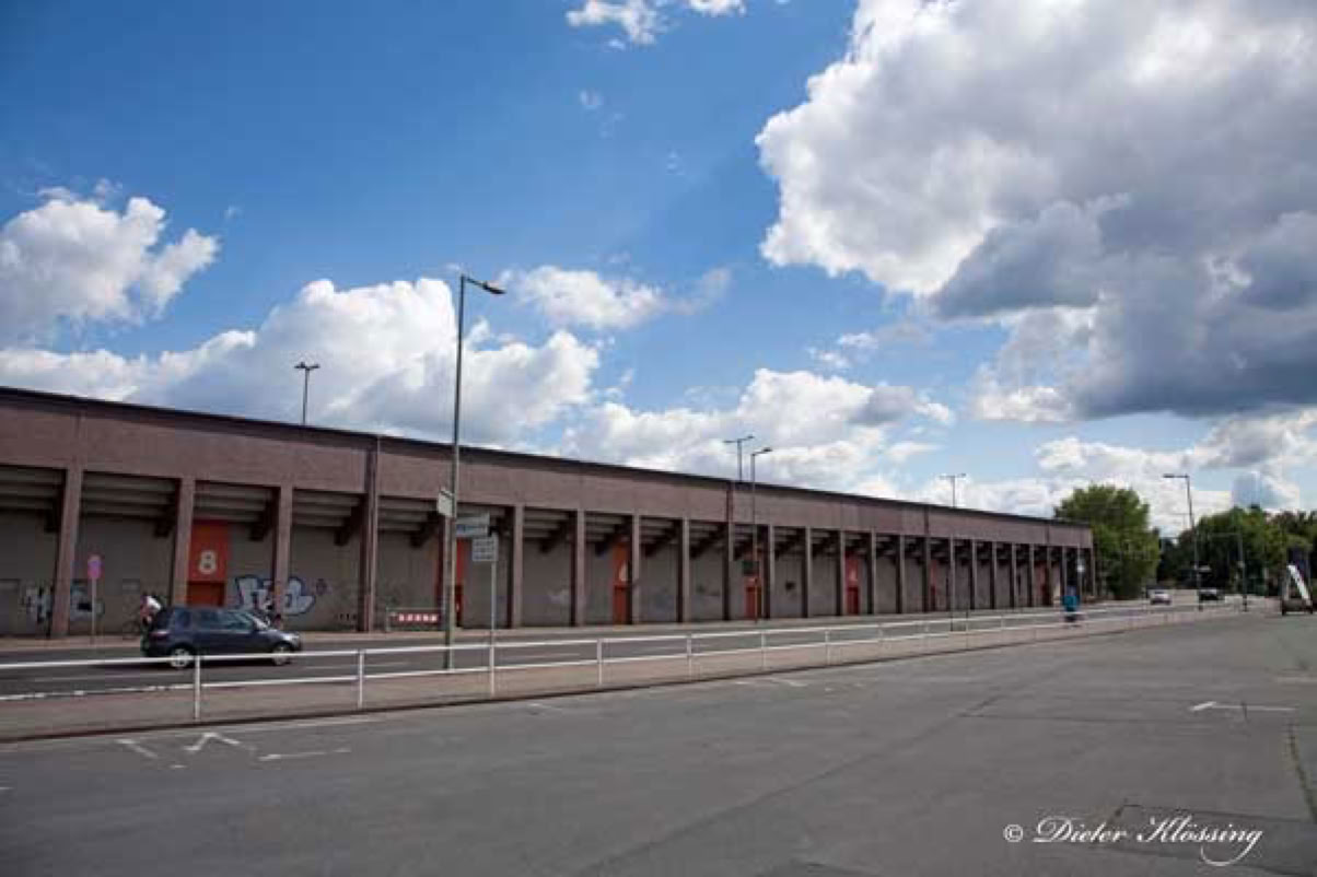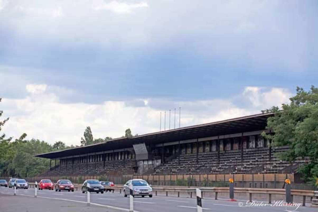 Die AVUS-Tribüne gegenüber vom Parkplatz der Deutschlandhalle