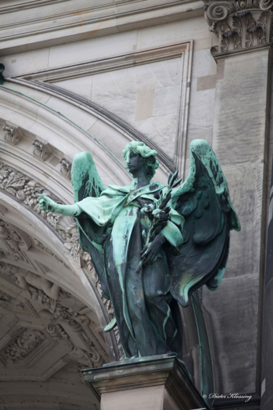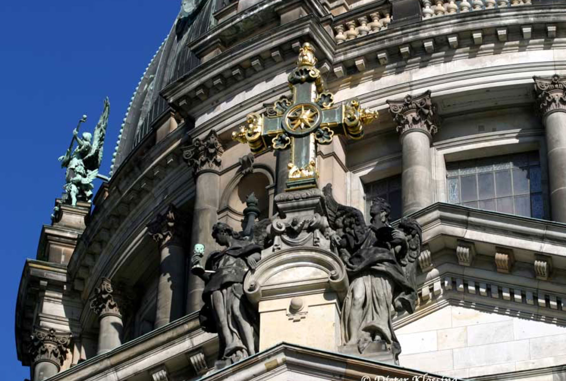 Die Figur auf der anderen Seite ist der „Engel der Wahrheit“. Die beiden Engel wiegen rund 1 Tonne und sind 100 Jahre alt. Insgesamt gibt es 35 dieser großen Statuen am Berliner Dom. (Aufnahme vom Mai 2014)