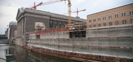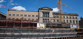 Nach dem 1999 erstellten Masterplan Museumsinsel sollte hier der "Berlin Cube" entstehen. Der britische Stararchitekt David Chipperfield entwarf einen schlichten Stahlwürfel mit viel satiniertem Glas.