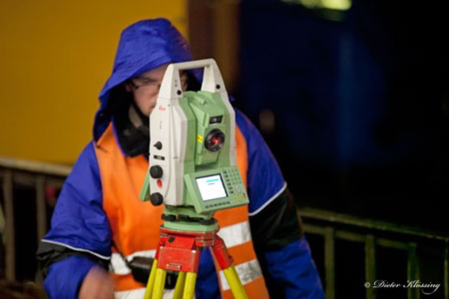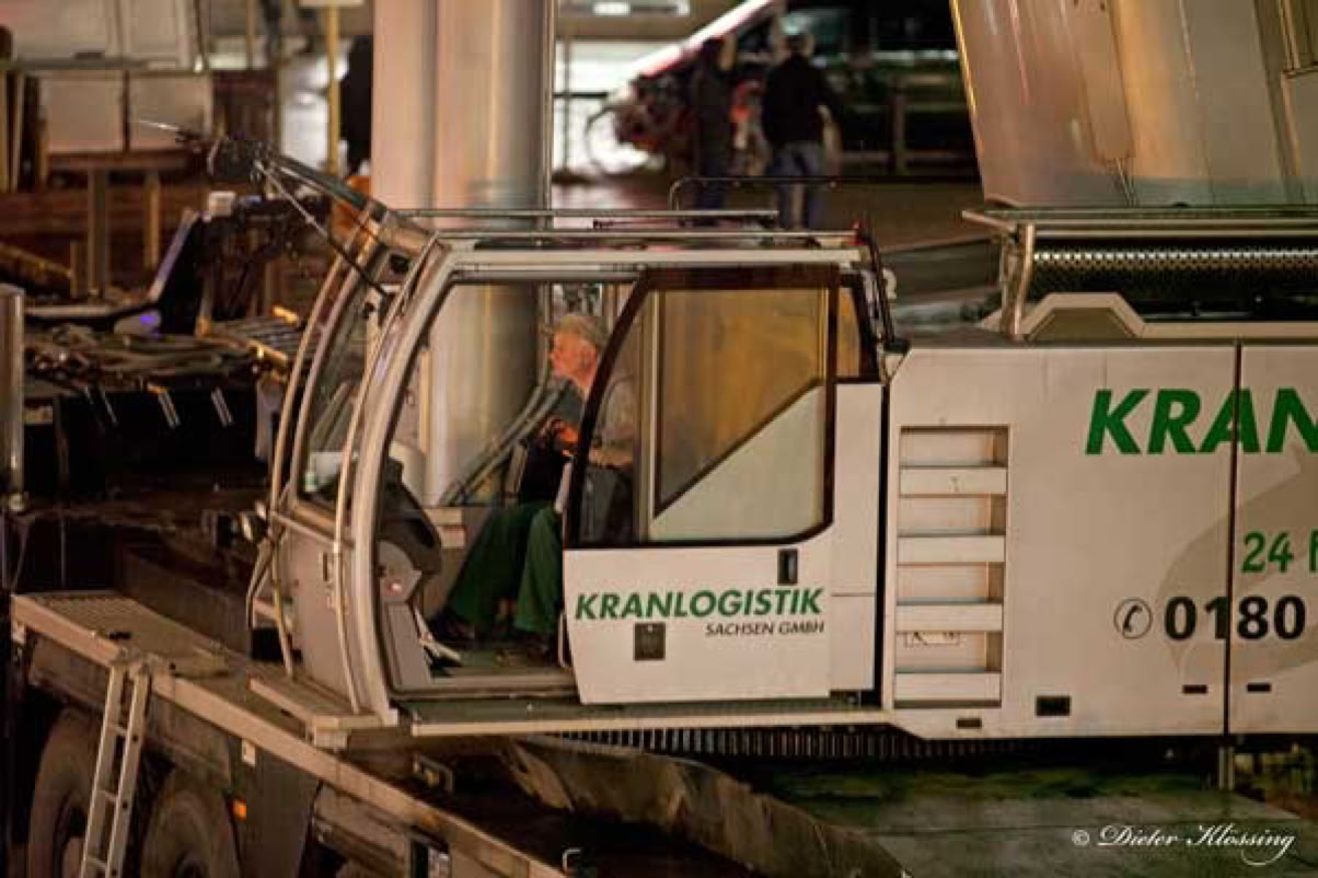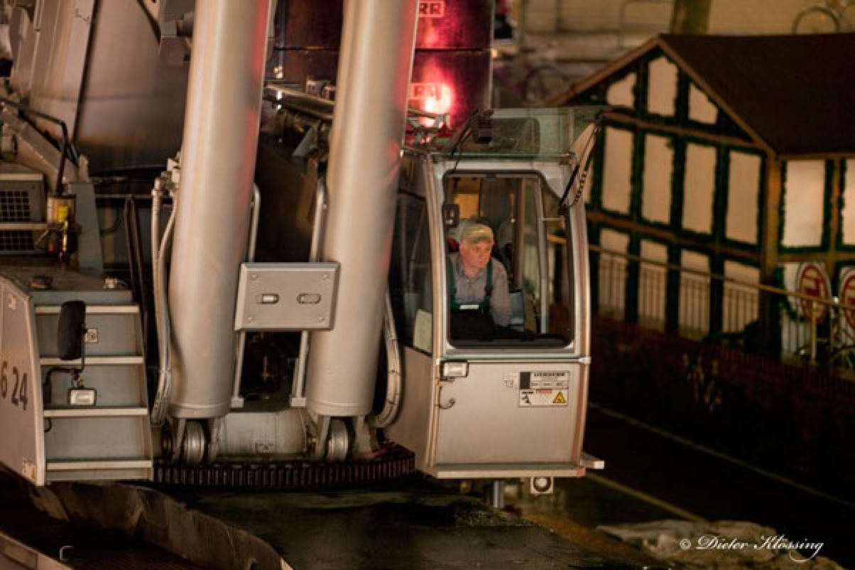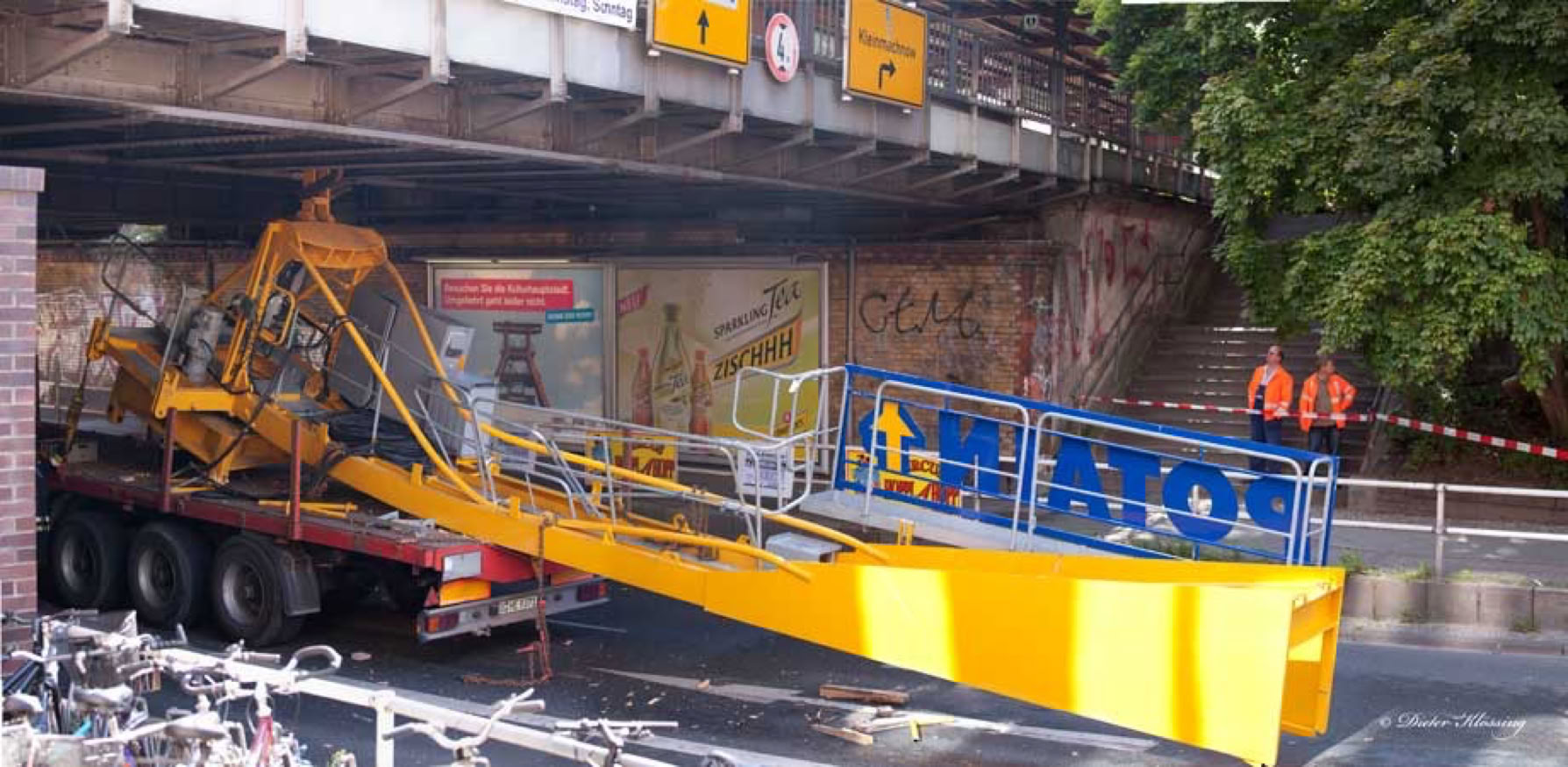 ...reagiert der Kranführer tief unten auf der Straße - und schwenkt die Brücke 4 cm weiter!