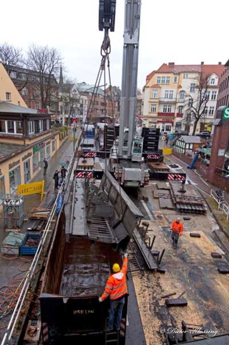 Der Kran ist riesig. Er nimmt die gesamte Straßenbreite ein und doch: Der Kranführer bringt die Teile der alten Brücke auf den Millimeter genau in den Container.
