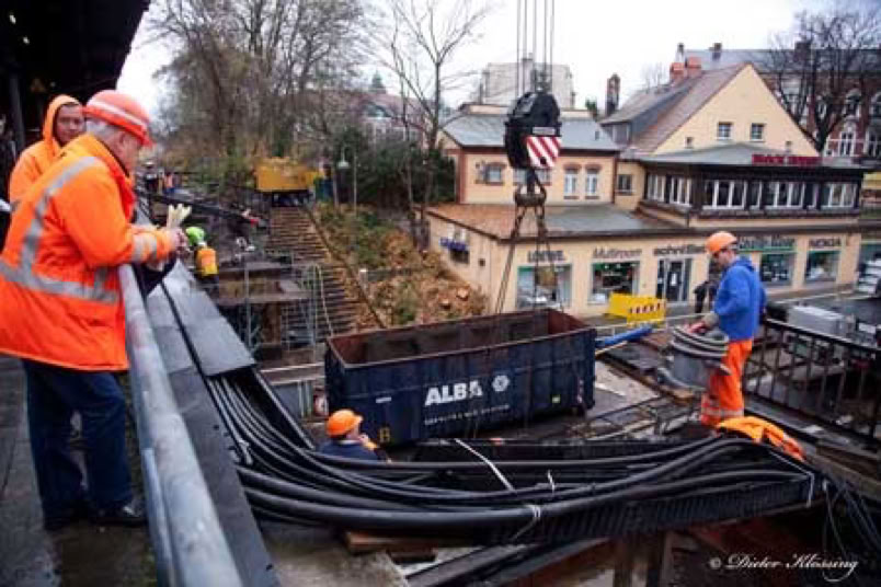 Als Vorarbeiten sind diverse Kabel schon verlängert worden um sie von den zu entfernenden Brückenteil Richtung Bahnhof schwenken zu können.