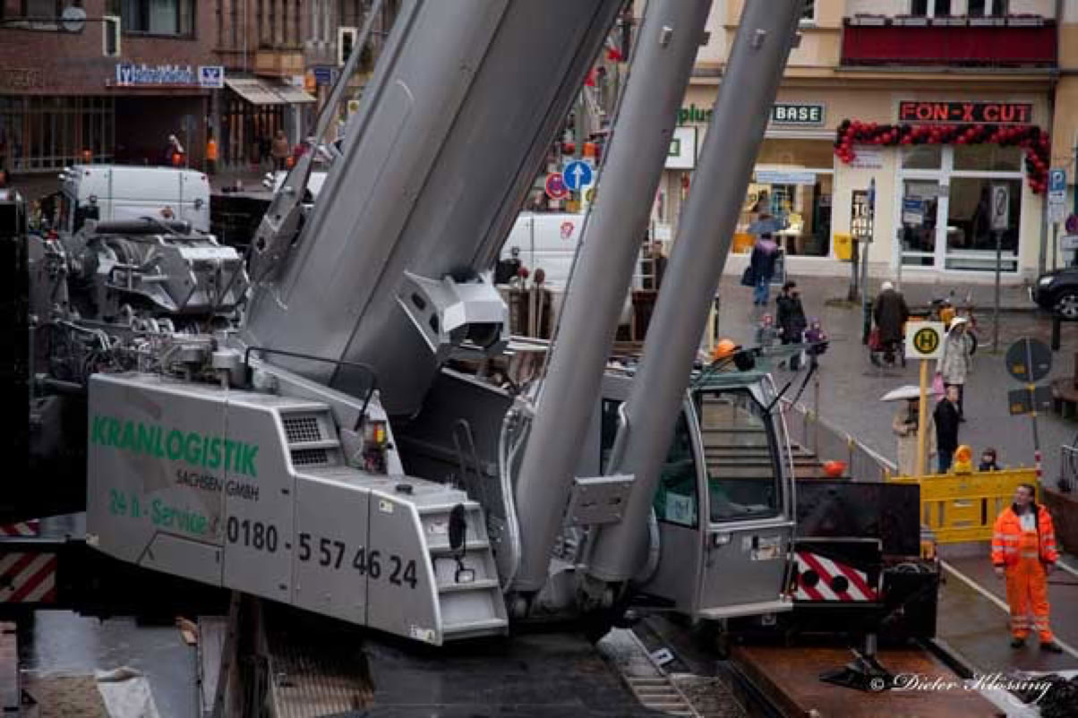 Der große und teure Kran wird durch einen kleineren für die Restarbeiten ersetzt