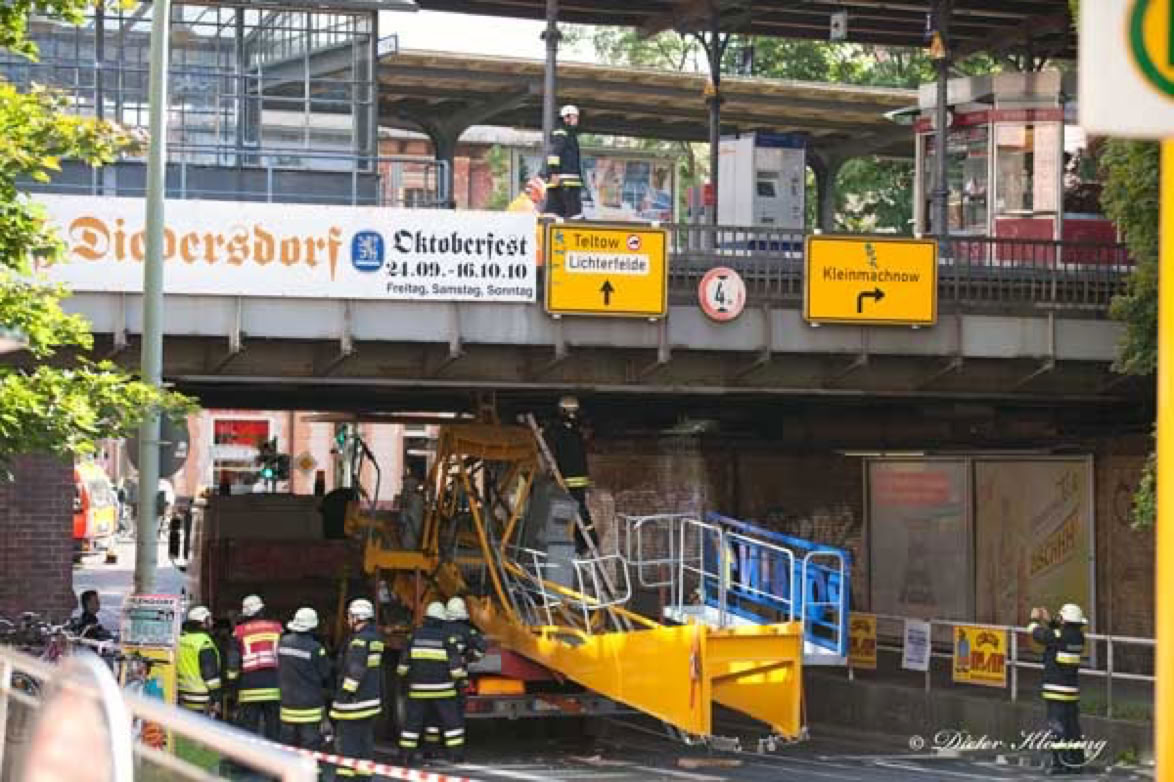 "Durchfahrthöhe 4 m" zeigt das verblasste und zwischen den anderen Schildern untergehende Verkehrszeichen an der S-Bahnbrücke. Immer wieder bleiben Lastwagen auf dem Teltower Damm unter der Brücke hängen. Selbst die Amis hatten damals auch schon Schwierigkeiten mit ihren M60-Panzer hier durchzukommen. Eine Höhenkontrolle gibt es nicht.