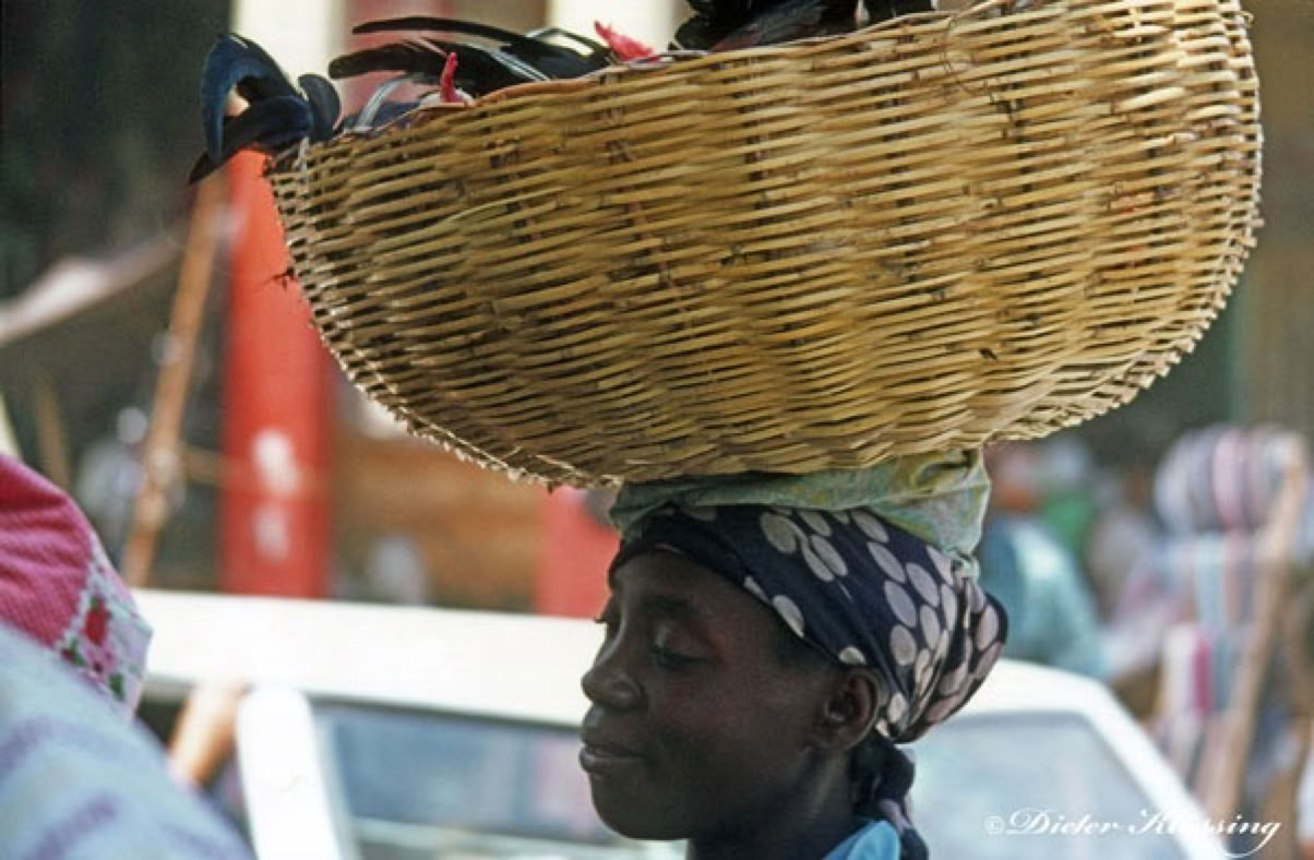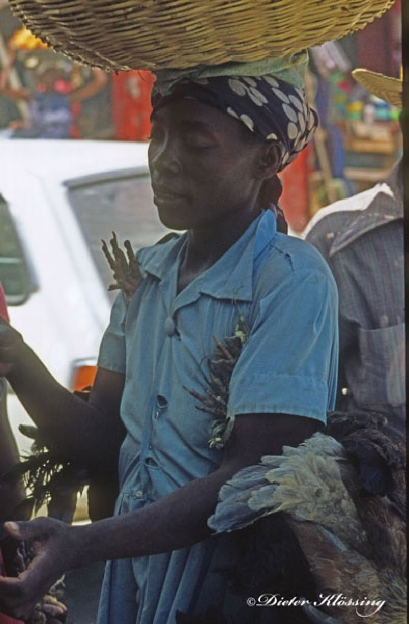 Die Dame hat Hühner unter dem Arm - lebende! Werden die für Voodoo gebraucht?