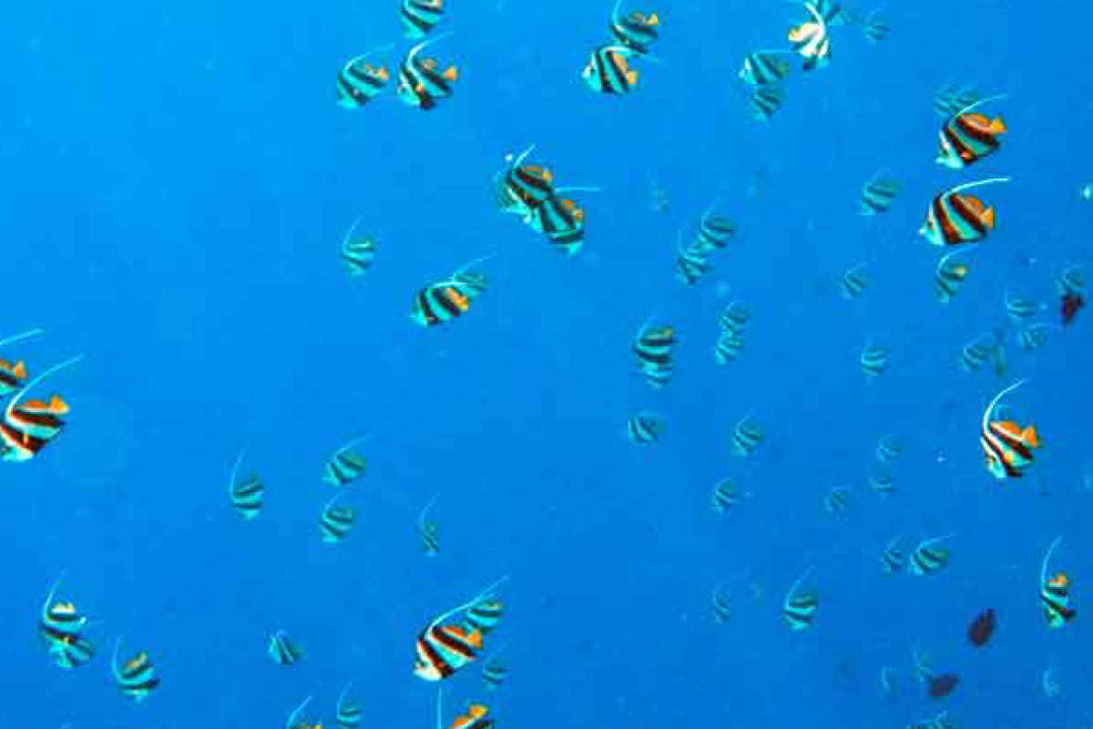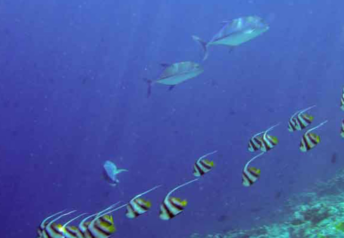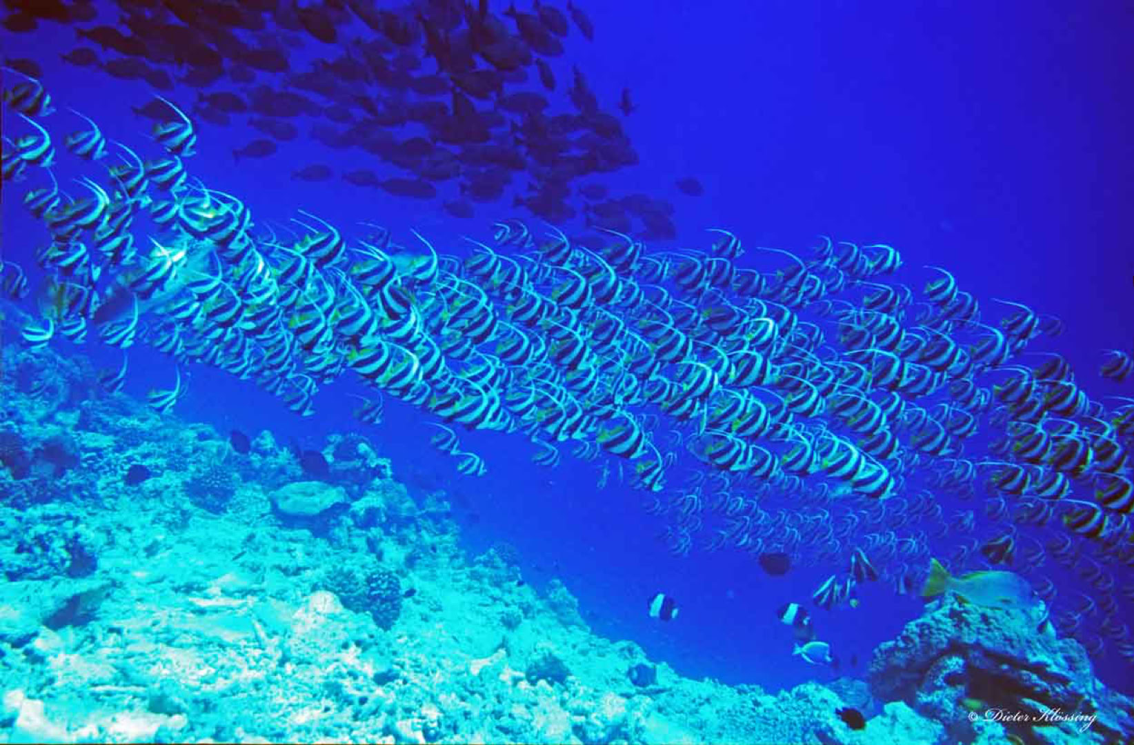 Das Bild zeigt einen Schwarm von Schwarzen Pyramiden - Falterfischen kurz vor Sonnenuntergang im Kanal zwischen den Inseln Kuramathi und Rasdu. Die Taucher haben aber nichts davon. Das Leben spielt sich oben ab.
