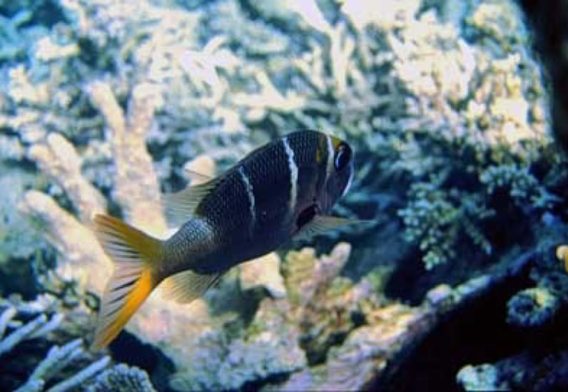 An den Riffen sind die gut zu erkennenden Jungtiere mit den drei ausgeprägten und dem an der Schwanzwurzel verwischten weißen Streifen und dem leicht gelb gefärbten Schwanz noch einigermaßen gut zu identifizieren. Sie sind recht häufig und haben eine Länge so um die 20 cm. Bei den ausgewachsenen Tieren ist es bei Weitem schwieriger, da sie wie viele andere Tiere am Riff einheitlich grau sind. Wie alle Jungtiere ist dieser Fisch sehr scheu und hier hat er sich vorsichtshalber schon mal in seine Fluchtstellung begeben, bereit, bei der kleinsten weiteren Bewegung das Weite zu suchen.