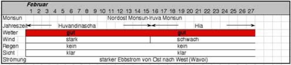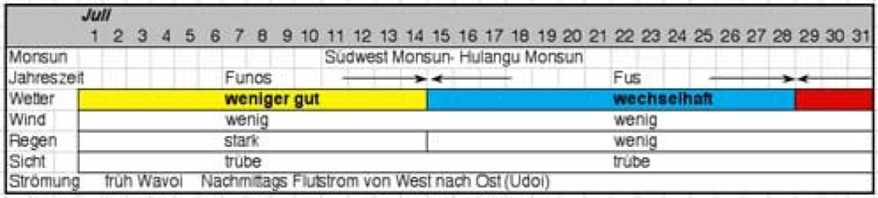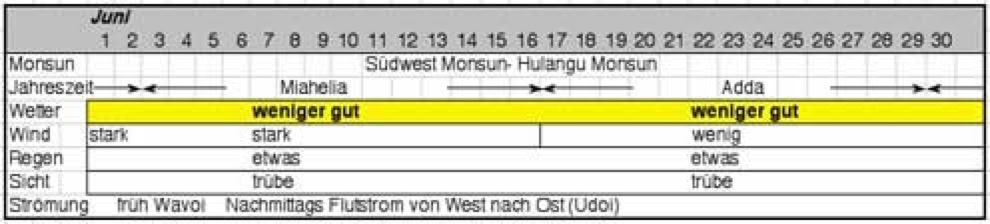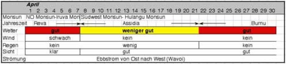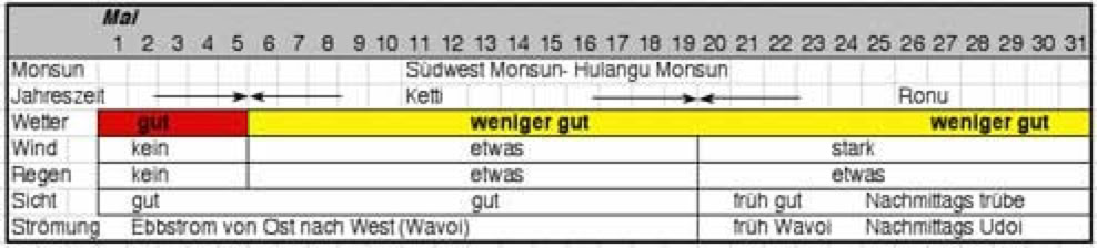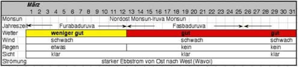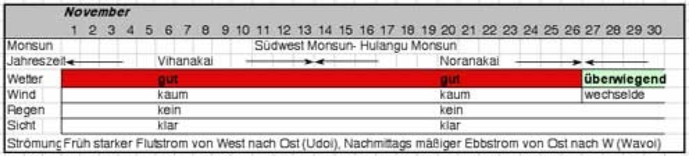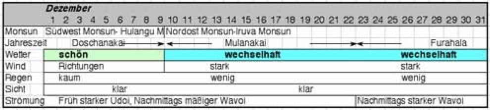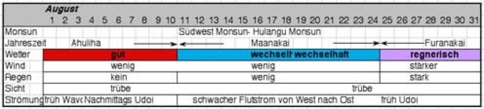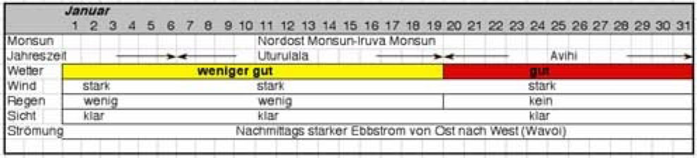 Aus genauen Beobachtungen der Windrichtungen und -stärke, Ebb- und Flutströme, Regen, Wolken und die Sicht unter Wasser entstand ein Kalender eingeteilt in 27 Jahreszeiten. Nicht, dass die Malediver tauchen gehen wollten, aber die Sicht unter Wasser war wohl eines der entscheidensten Kriterien: war es trüb, gab es viel Plankton im Wasser und damit auch viel Fisch.