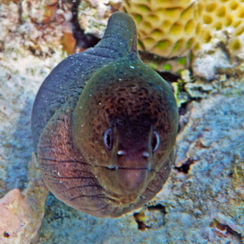 Es ist die bekannteste und häufigste Muräne auf den Malediven. Sie sind kurz nach Sonnenaufgang zu sehen, wenn sie von der Jagd auf schlafende Papageifische, Kraken, Krebsen und auch Aas nach hause kommen und