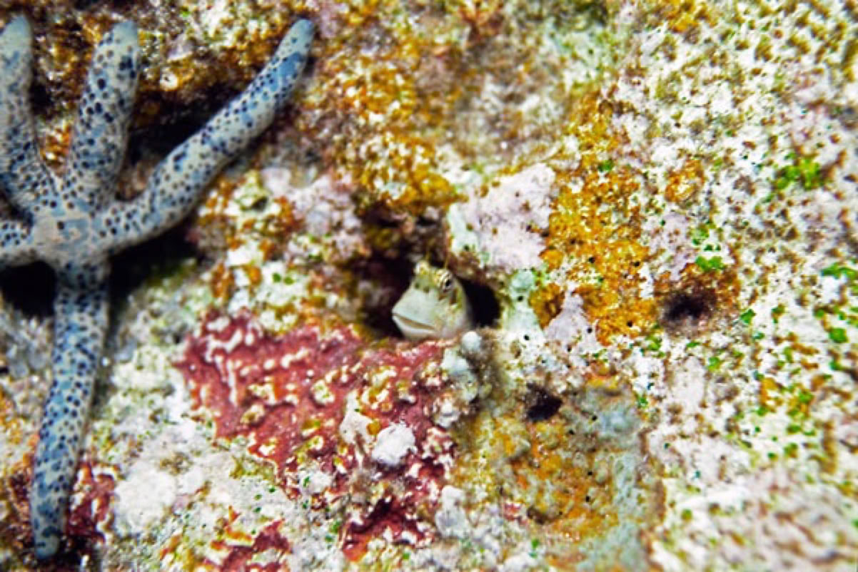 Auf dem Weg zum Riff sah ich in allerflachstem Wasser, ich konnte grade so schwimmen, etwas am Fuße der Korallenmauer weghuschen. Ich wartete. Nach einer Weile tauchte der lustige und neugierige Kopf dieses Blennies auf und - so scheint es bei den Fischen mit dem breiten Maul - lachte mich an. Bei der kleinsten Bewegung verschwand er unter der nächsten Deckung und kam nicht mehr hervor.
