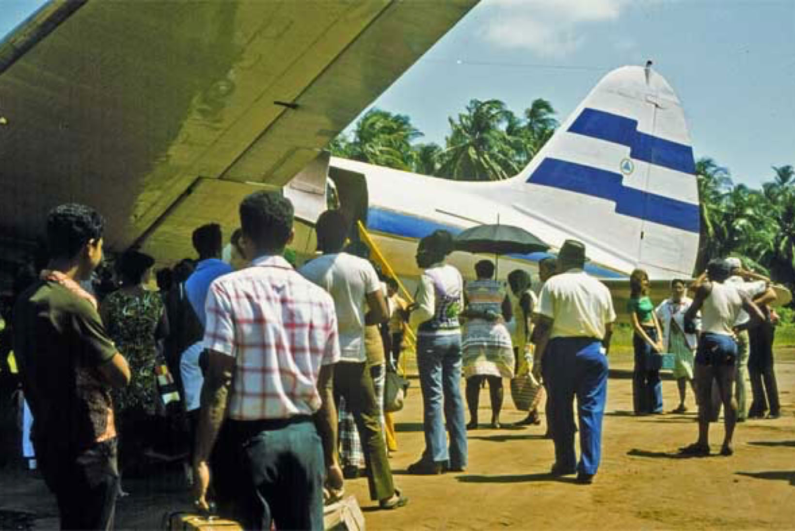Der Höhepunkt im Inselleben! Wie geht es Tante Maria? Post! Zeitung, Ersatzteile, Büchsenmilch. Endlich passiert etwas auf der Insel. Fernsehen? Völlig unbekannt. Aber hier gab es den neuesten Tratsch, in Ruhe zu erzählen im Schatten unter der Tragfläche.