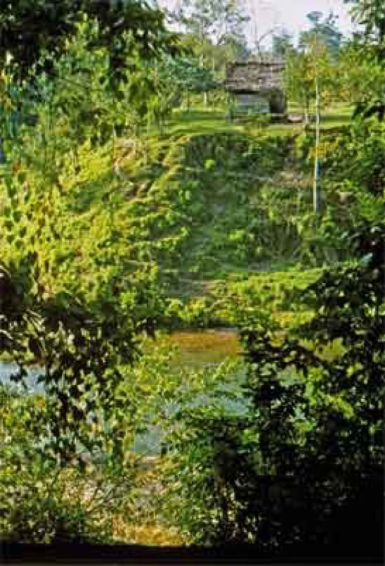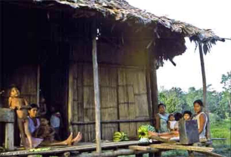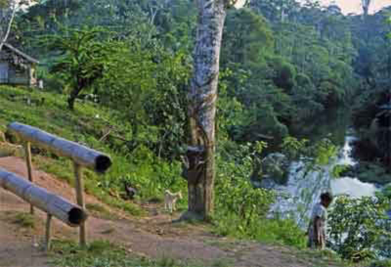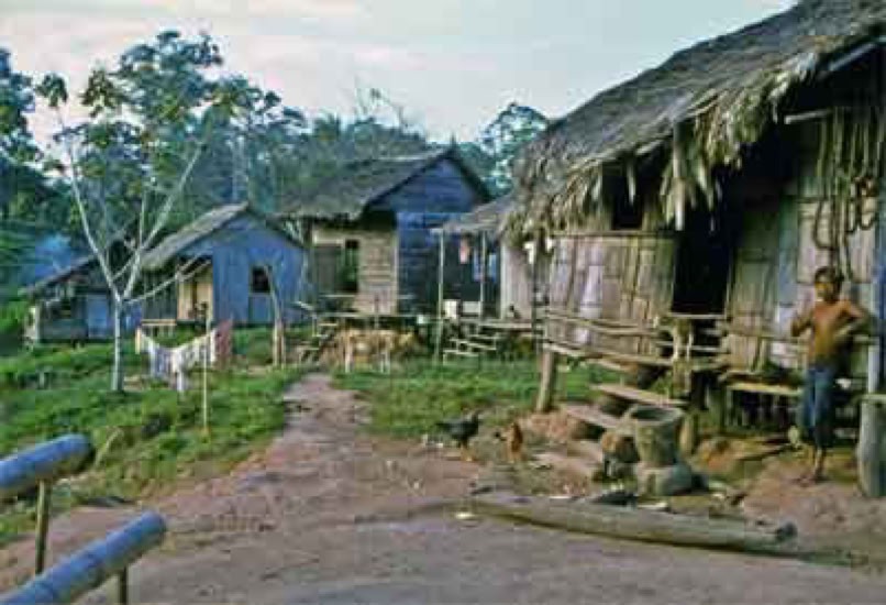 Die Schönheit und Ruhe der Lichtung, in der das Dorf lag, nahm einem den Athem. Es ist einer der unvergessen und schönsten je erblicken Orte in der Welt und so in Erinnerung geblieben. Auf dem Foto oben nicht darzustellen. Ein kleiner Bach musste noch überquert werden und dann stand man mit schlechtem Gewissen mit zwischen den ärmlichen Hütten. Was würden wir sagen, ginge plötzlich zuhause einfach unerwartet die Wohnungstür auf und ein Japaner trampelte grinsend mit Fotoapparat vor der Nase mitten durch das Wohnzimmer?