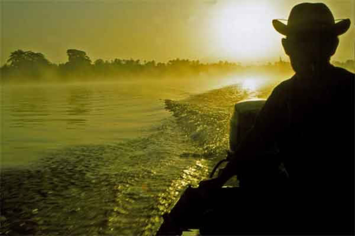 Ohne jede Pause knatterte das Boot pfeilschnell über den Fluss der keine erkennbare Strömung zeigte. Sieben Stunden schon. Unterbrochen nur für das Wechseln der Scherstifte und Nachtanken aus den Kanistern, zwei- oder dreimaliges Zusteigen von ebenfalls stummen Reisenden.