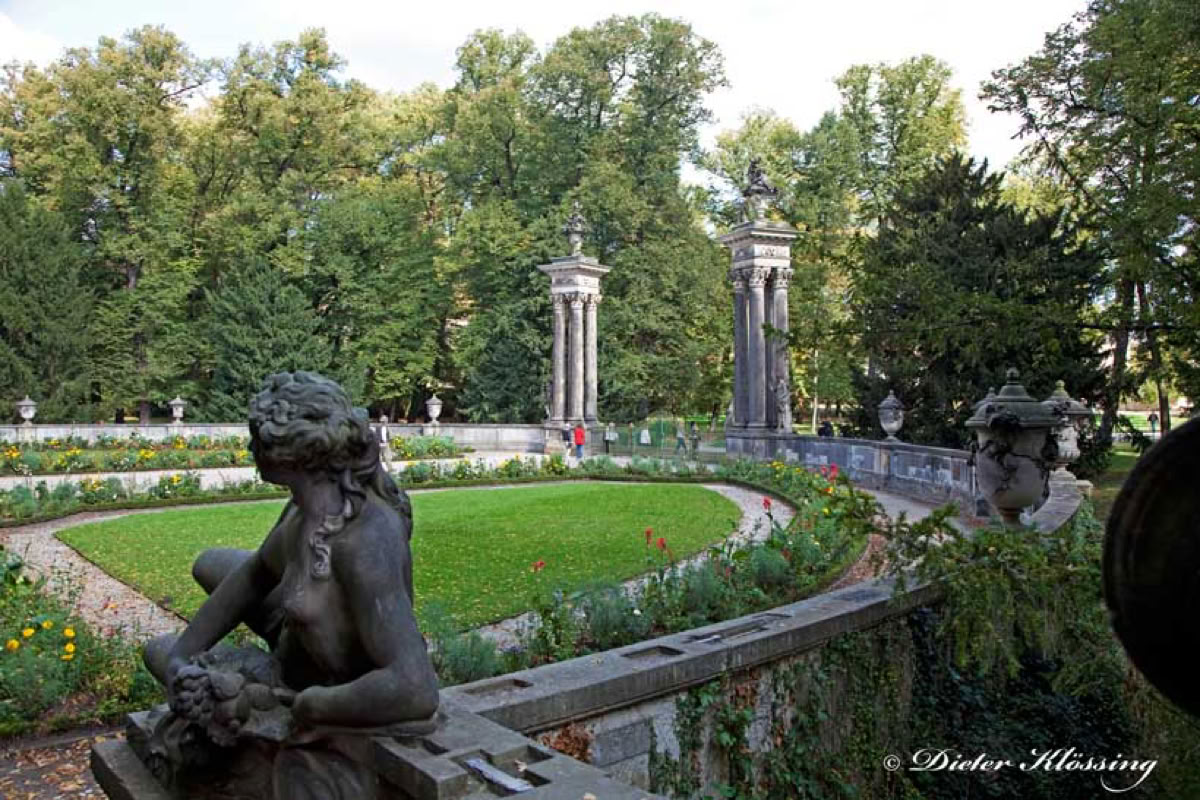 Auch 8 monumentale Vasen mit je zwei Schlangen stehen ebenfalls hier. Die Vasen auf Sockeln sind aus Marmor und die Schlangen aus Blei. Sie wurden 1758 von Mathias Müller geschaffen.