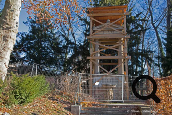 Auf der anderen Straßenseite am Obelisk außerhalb des Parks dann das Tor zum ehemaligen Winzerberg und das Winzerhaus.