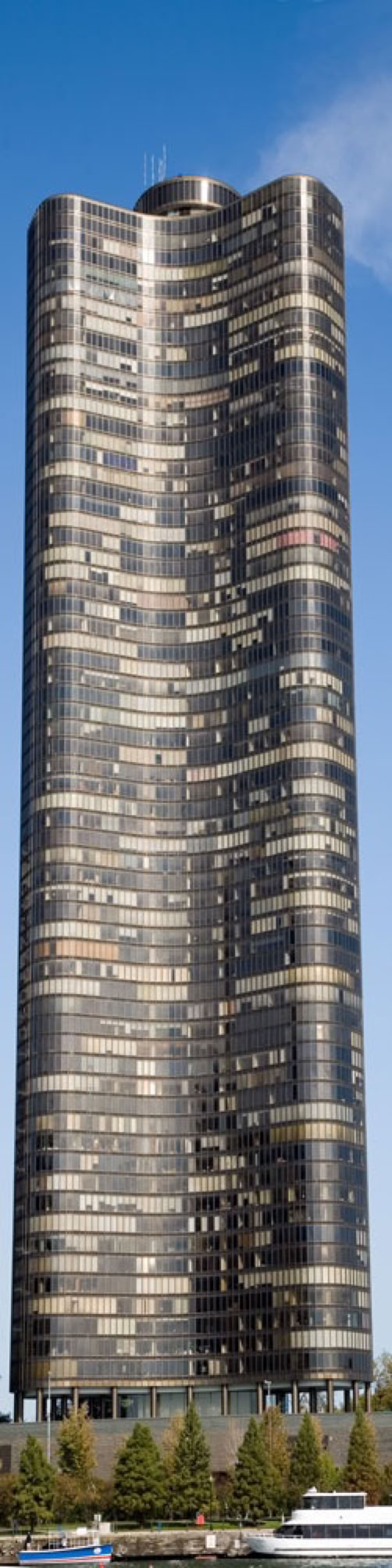 Das schnörkellose weiße Hochaus ist das Aon Center . Es wurde 1973 eröffnet, hat 83 Stockwerke und ist 346 m hoch. Standard Oil hat seinen schmucken Wolkenkratzer mit 43.000 Platten aus italienischem Marmor verblendet. Man gönnt sich ja sonst nichts...