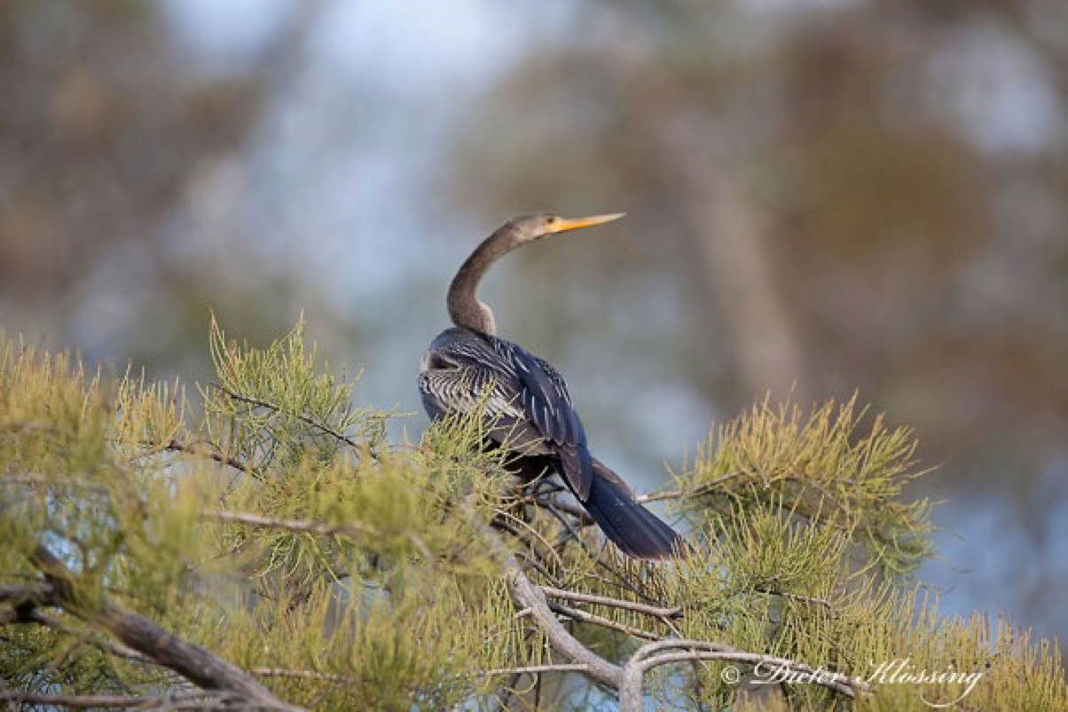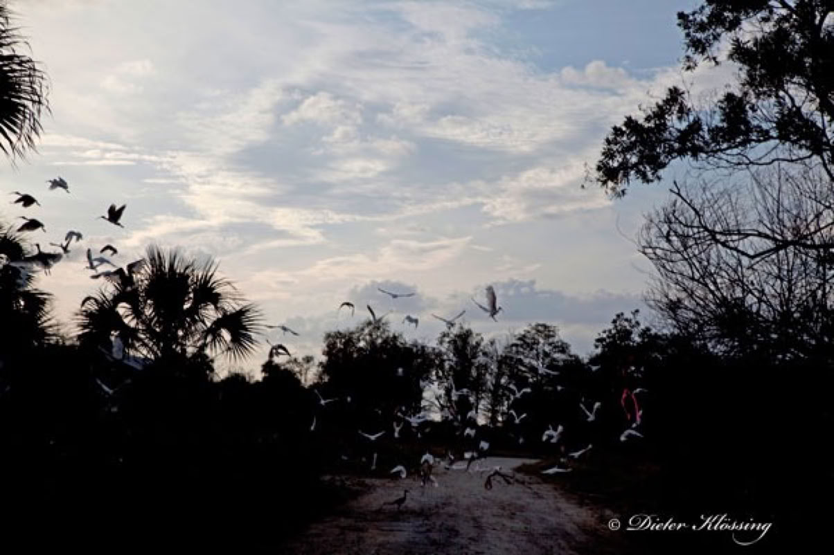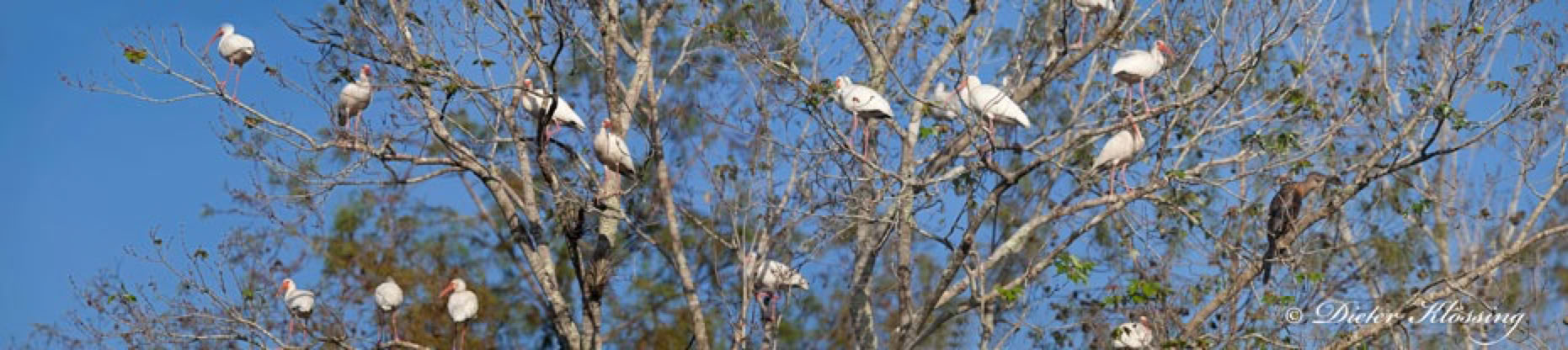 Jede Menge Vögel. Die Ibisse sind schon zum Schlafen eingeflogen, der Anhinga pflegt noch sein Gefieder.