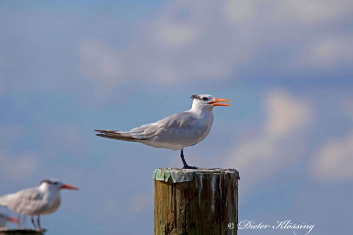 Einer der Vögel, die oben auf dem Bild zu sehen sind: Königsseeschwalbe-Sterna maxima-Royal Tern
