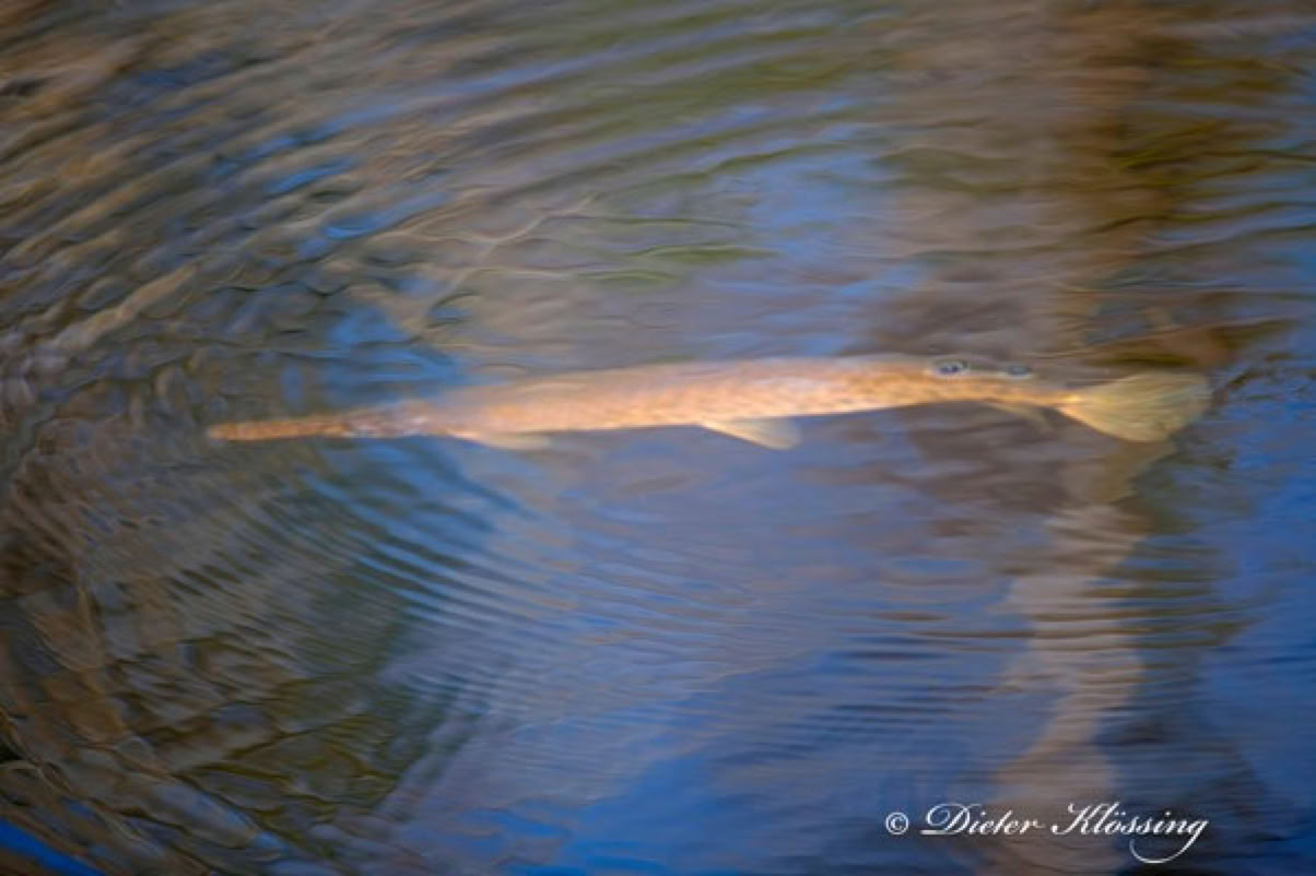 Seltsamer Fisch, ein Florida Gar, bis 1,32 Meter lang. Er hat (falsche) Augen auf dem Schwanz. Als Tarnung.