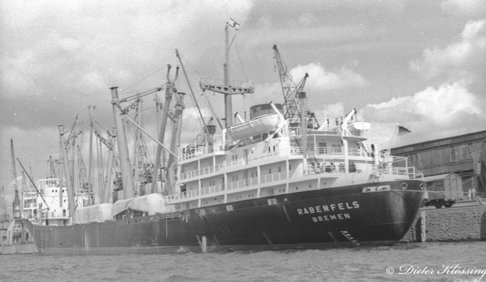 Die Rabenfels war der achte Frachter der Lichtenfelsklasse und weltweit die ersten Schiffe mit dem v-förmigen Stülken-Schwergtladebaum. Die Aufnahmen entstanden 1962 im Hamburger Hafen.